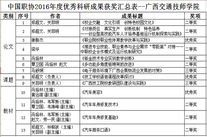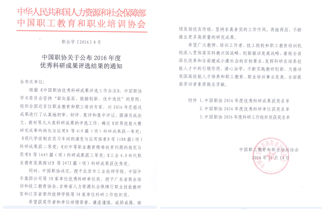 近日,根據中國職工(gōng)教育和職業培訓協會《中國職協關於公布2016年度優秀成果評選結果的通知》(職會字[2016]8號(hào))文件獲悉,我院選送的14個成果中有13個(gè)獲獎,其中,一(yī)等獎1二(èr)等獎7三(sān)等獎2個(gè)優秀(xiù)獎3