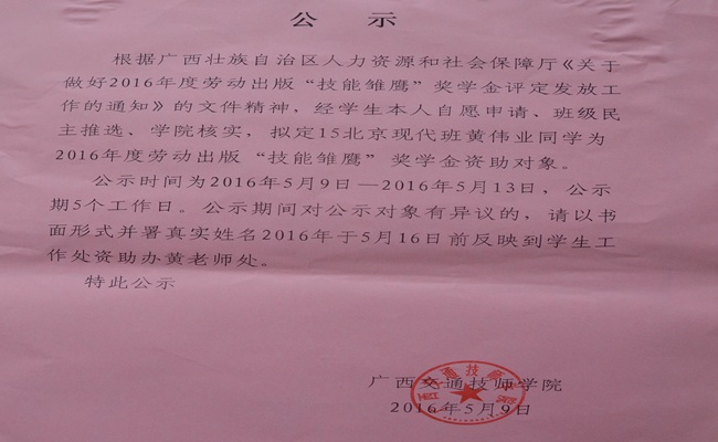 勞動出版“技能雛鷹”獎學金是人力資源(yuán)和社會保障部麵向全國技(jì)工院校出資設立,獎勵對象為品學兼優的高級技工學(xué)校、技師學院高級工班或預備技師(shī)班的在校學生。接到人社部(bù)《關於(yú)做好2016年度勞動出版“技能雛鷹”獎學金評(píng)定發放工作的(de)通知》後,我院在第一時間成立了“技能雛鷹”獎學(xué)金評審小組,由(yóu)各班主任遞交(jiāo)申請,學生工作處對班主(zhǔ)任提名的候選人從學習成績、品德、技能等各方麵進行了審核討論,經評審小組複審後決定推(tuī)薦學院15北京現代(dài)班黃偉(wěi)業同學參加“技能雛鷹”獎(jiǎng)學金的評選,同時對黃偉業(yè)同學的材料進行了公示,並將申請材料(liào)上報廣西壯族自治區人力(lì)資源(yuán)和社會保障廳。經區人力資源(yuán)和(hé)社會保障廳有關部門(mén)的審核(hé),最後確(què)定我院黃偉業同學享受2016年度“技能雛鷹(yīng)”獎學金。