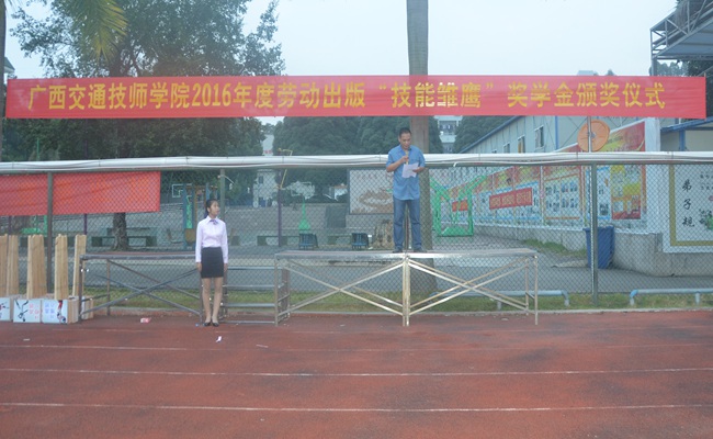 1月7日早上,2016年度勞動出版“技能雛鷹”獎學金頒獎儀式在我(wǒ)院足球場隆重舉行。頒獎儀式由我院學生工作處副主任梁勇主持(chí),學院樊海林助理、學生工作處領導和全體班主任及在校班級全體學生出席頒獎儀式。
