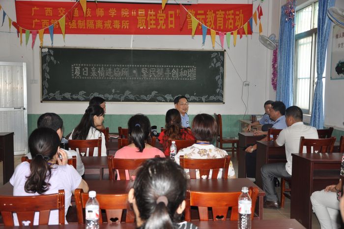 為加深黨員幹部對毒品危害社會的(de)感(gǎn)觀認識,強化思想防範,第三黨支部踐行“三嚴三實”。在副院長陸天雲的帶領下,黨支(zhī)部28名黨員幹部於(yú)2015年6月30日前往廣西第一強(qiáng)製隔離戒毒所(以下簡稱戒毒所)開展黨員警示教育活(huó)動。