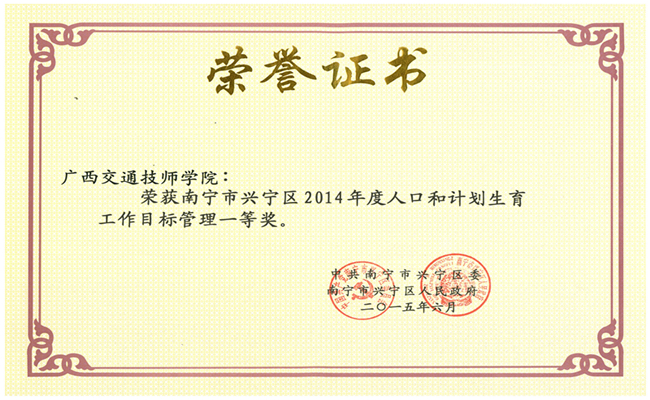 我(wǒ)院榮獲南寧市興(xìng)寧區2014年度人(rén)口和計劃生育工作目標管理一等獎榮譽稱號