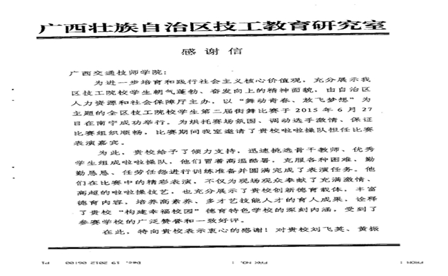 近日,自治區技工教(jiāo)研(yán)室給我院發來感謝信。信中對我院啦啦操隊在6月27日出演的嘉(jiā)賓節(jiē)目表示十(shí)分的感謝,同時對參演的學生和指導老師給予了高度的讚揚。信(xìn)中寫道:“他們在比賽中的精彩表演,不僅為現場觀眾奉獻了充滿激情、高超(chāo)的啦啦操(cāo)技藝,也充分展示了貴校創新德育體(tǐ)裁,豐富德育內容,培養高素(sù)養、多才藝技能人才的育人成果(guǒ),詮釋了貴校‘構建幸福(fú)校園’德育特色學校(xiào)的深刻內涵”。