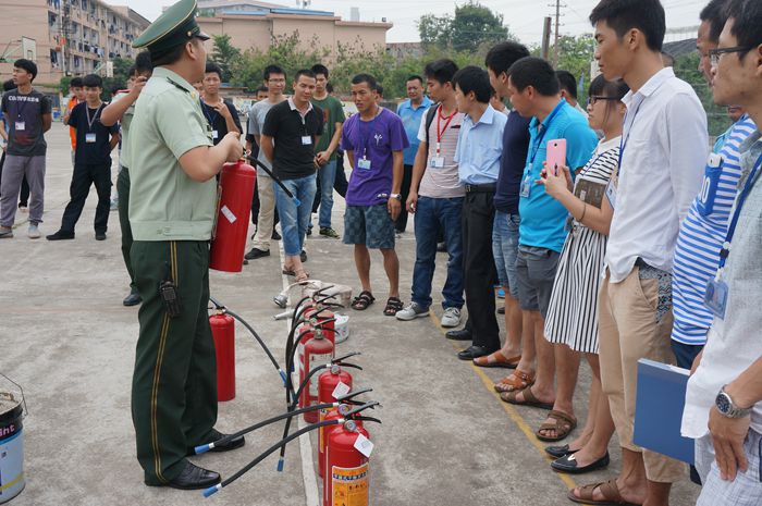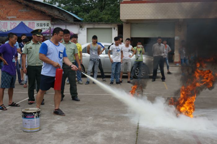 我院職工在消防軍(jun1)官(guān)的指導下使用幹粉滅火器進行滅火