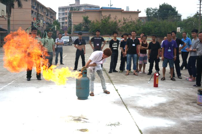 學生在消(xiāo)防(fáng)軍官的指導下(xià)對熊熊燃燒著的煤氣罐進(jìn)行滅火