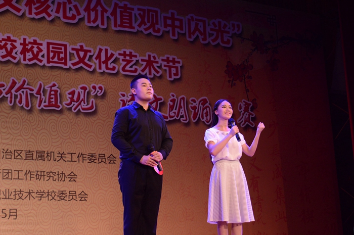 5月16日下午,第五屆廣西區直院校校園文化藝術節“傳誦中華經典,踐行(háng)核心價值觀”詩文朗誦比賽中職組決賽在廣西理工職業技術學校風華禮堂進行。參(cān)加比賽的共(gòng)有16個學(xué)校的代表隊,每支代表隊的(de)人數為2~8人。在信(xìn)息與商務係黃揚飛老師的帶(dài)領下,14汽(qì)車檢測技師班的薑文凱及14汽車技術服務與營(yíng)銷的董麗芳兩位同學組成了我院代表隊參加決賽。