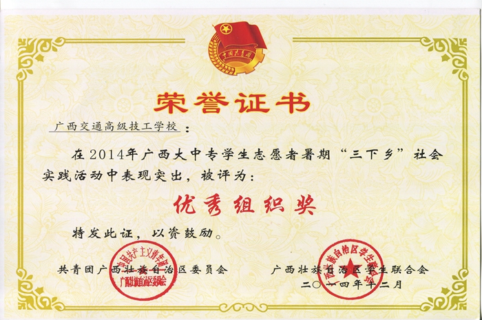 2014年自治區黨委宣傳(chuán)部、自治區文明辦、自治區教育廳、共(gòng)青團廣西區委、廣西學聯組織開展全區2014年大中專學生誌願者(zhě)暑期(qī)“三下鄉(xiāng)”社會實踐活動評比表(biǎo)彰活動,評比出一批(pī)優秀(xiù)組織獎、優秀指導教師、先進個人、優秀支持單位。