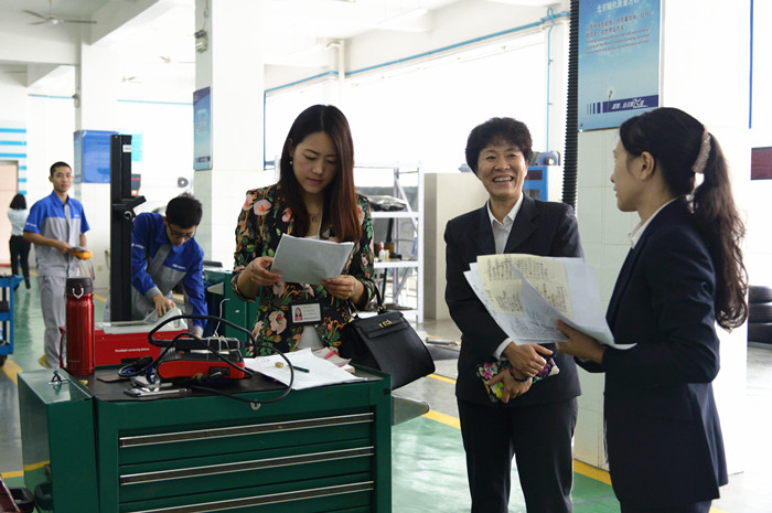 中德諾浩(北京)教育(yù)投資有限(xiàn)公司院校合作部部長馬玉燕(右三)了解我院汽車類教材使(shǐ)用情況