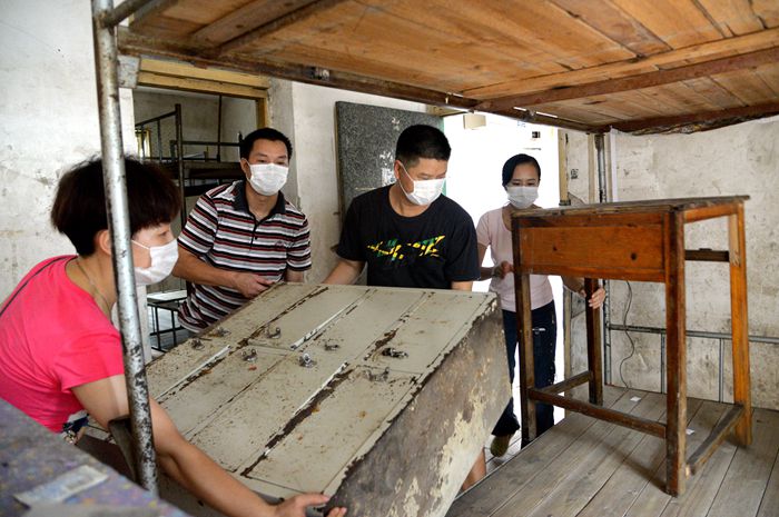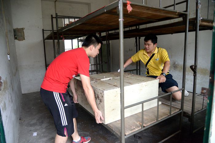 學院譚勁濤院長助理與黨(dǎng)員教師整理學生宿舍床架