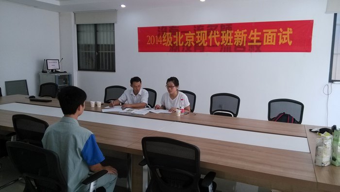 66上(shàng)午,2014級北京現代班新生麵試在大(dà)師工作(zuò)室展開,北京現代李翔女士主持進(jìn)行選拔。