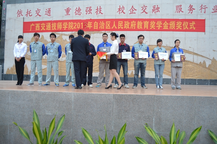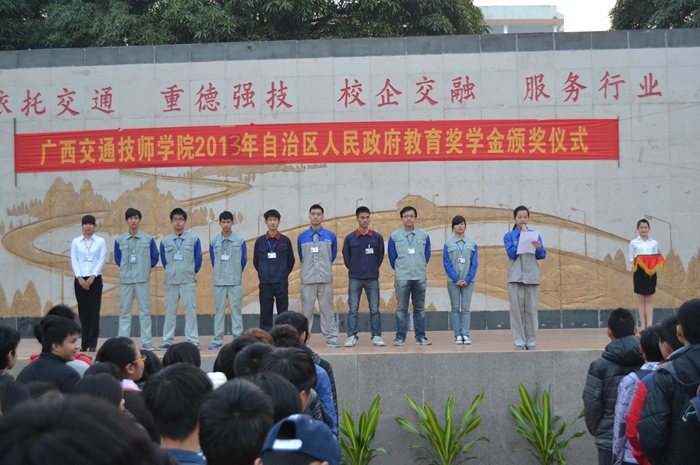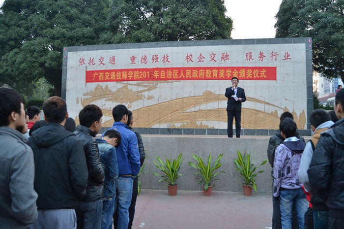 2013年12月2日早上,2013年(nián)度(dù)自治區人民政府教育獎學金頒獎(jiǎng)儀式在我院燈光球場隆重舉(jǔ)行,儀式由我院學生工作處副主任梁勇主持(chí)。學院副院長鍾修仁出席儀式並致(zhì)辭,學生工作處領導和全體幹事、各班主任及在校班級全體學生參加(jiā)了(le)儀式。全院共有113名學生榮獲2013年度自治區人(rén)民政府教育獎學金(每人2000元),共計22.6萬元人(rén)民幣。