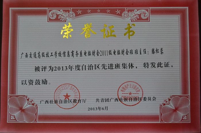 2011級電腦財會(huì)班獲得了2013年度自治區先進(jìn)集體