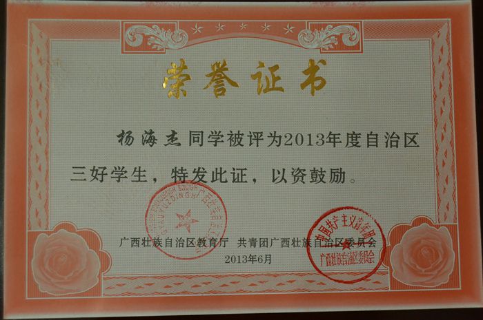 楊海傑同學(xué)被評為2013年(nián)度自治區三好學生