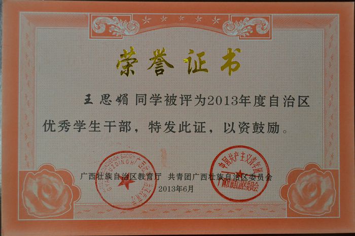 王思媚同學(xué)被評為2013年度自治區優秀學生幹部