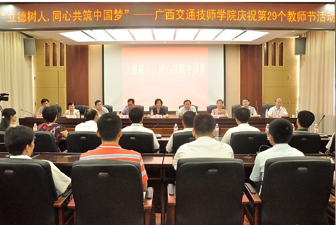 910日下午,在第29個教師節到來之際,我(wǒ)院在信息中心多功能會議室舉行主題為“立德樹人,同心共築中國夢(mèng)”的慶祝暨表彰大會。自治區交通運輸廳科教(jiāo)處處長岑(cén)春,自治區道路運輸管理局(jú)黨委書記(jì)孫永生,自治區交通運輸廳科教處(chù)副處長韋揚、副調(diào)研員(yuán)張迎春,自治區道路運輸管理局黨委辦公室主任(rèn)王愛君、職業技能管理科科長肖三亮(liàng)、人事科副(fù)科長劉(liú)亮等領導出席大會(huì),為我院教職(zhí)工帶來親切慰問,並為獲獎教師頒獎。大會由(yóu)我院(yuàn)黨委書記羅華主持。