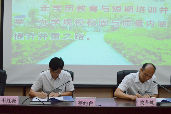 圖八:韋紅教院長與(yǔ)關菲明副院長簽訂責任書
