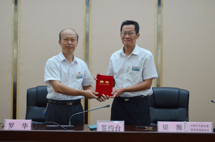 圖十:羅華書記為“中職學生(shēng)職業(yè)素養培訓基(jī)地” 項目負責(zé)人梁源頒(bān)發聘書(shū)
