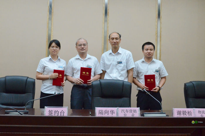 圖十二:關菲明(míng)副院長為“汽車(chē)營銷專業”、“物流管理專業”主(zhǔ)要負責人(rén)封桂炎、陸向華(huá)、謝毅鬆頒發聘書(shū)