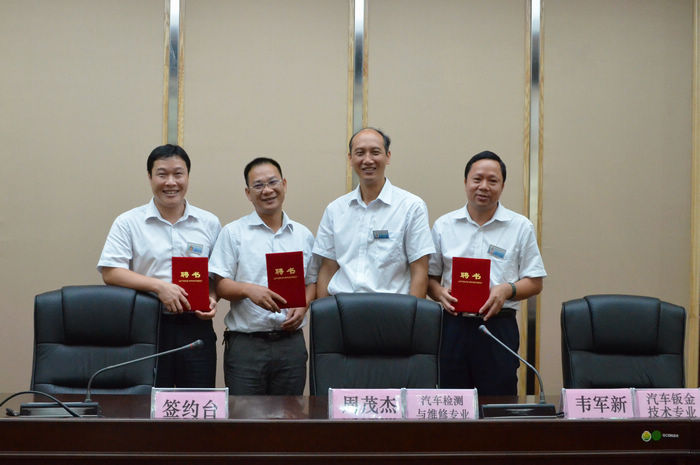 圖(tú)十一:關菲明副院長為“汽車檢測與維修專業”、“汽車與鈑金技術專(zhuān)業”主要負(fù)責人(rén)樊海林、周(zhōu)茂傑、韋軍新頒發聘(pìn)書