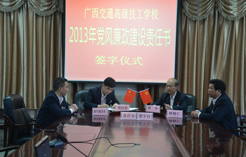 4月12日上午,我校2013年黨風廉政建設責任書簽字儀式在辦公樓二樓會議室舉行。校(xiào)黨委書記羅華主持儀式。韋紅教校長、羅華書記分別與各分(fèn)管領導及各部門負責人簽訂了黨風(fēng)廉(lián)政建設(shè)責任書。