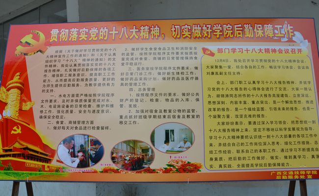 圖9:後勤服務處展板——貫(guàn)徹落實黨的十(shí)八大精神 切實做好學院(yuàn)後勤保(bǎo)障(zhàng)工作