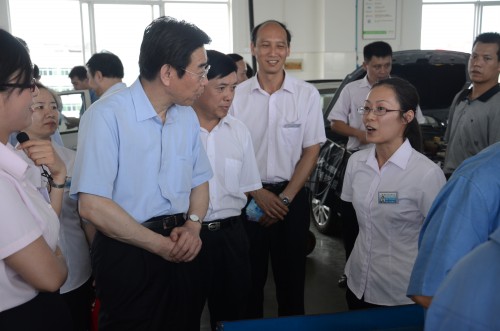 在考察過程中,王曉初副部長(zhǎng)不時向韋紅教(jiāo)院長詢問在校生高級工和預備技師數量、開展職業技能(néng)培訓、生源地分布、畢業生薪酬、新校區建設、校企合作等情況,並興致勃勃地與正在授課的汽車美容中心專業勞一民老師、汽車商務專業(yè)韋欣烜老師、汽車檢測與維修專業的李宣葙、潘利丹(dān)老師、北京(jīng)現代汽車訂單班(bān)李春等老師親切交談,詳細詢(xún)問實訓內容、教學方法、教學效果和個人進修培訓(xùn)情況,還與正在(zài)進行(háng)汽車(chē)發動機拆裝檢測的09級學生麵對(duì)麵交流,了解他們的學習、實習和生活情況。