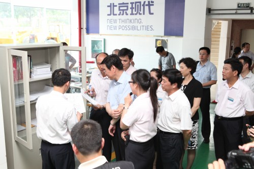 圖二:人社部王曉初副部(bù)長(右一)在我院汽車鈑金與塗裝(北京史賓尼斯)實訓中心調研