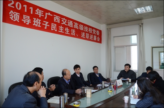 12 26 日上午(wǔ),學校黨委在(zài)辦公樓6樓會議(yì)室(shì)召開黨(dǎng)委領導班子2011年度民主生活、述(shù)職述廉(lián)會。自治區道路運輸管理局黨委辦公(gōng)室主任王愛君、人事科科長鍾邱蒞臨(lín)指(zhǐ)導。