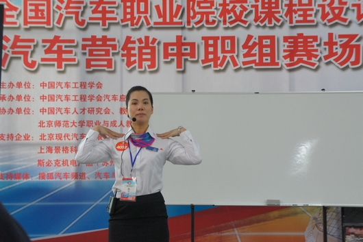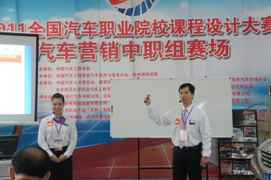11月4日的複賽環節中,我校代表隊憑借(jiè)對行為導(dǎo)向教學法的深(shēn)刻理解(jiě),緊扣(kòu)企業文化、工學結合的主題,以演講的(de)說(shuō)課方式闡述了我(wǒ)校(xiào)汽車(chē)營銷課程的(de)教學理念(niàn)及課程組織方式,博得了專家評(píng)委及各院校(xiào)觀摩(mó)團的(de)陣陣掌(zhǎng)聲。經過激烈角逐,我校參賽隊從64支隊伍中脫穎而出,以四強的身份躋身次日的決賽(sài)環(huán)節。梁麗麗(lì)、覃毅兩位教師憑(píng)借穩定的心理素質、過硬的專(zhuān)業技術水平,在課程中始終貫徹5S現場管理,結合企業文化 ,突出體現(xiàn)了任務驅動的教學(xué)模式,得到了專家評委的一致好評,一位企業評(píng)委這樣評價:“這是一堂生(shēng)動的(de)企業培訓課。”我校代表隊最終獲得本次大賽一等獎的好成績。