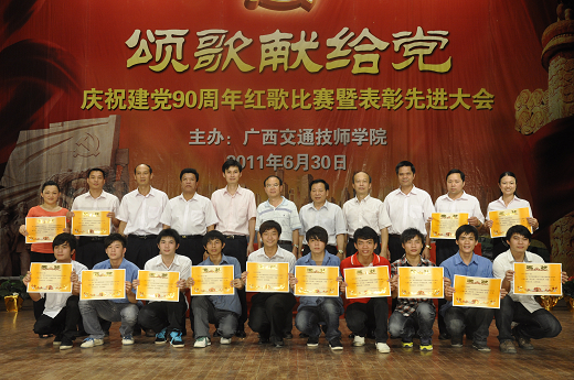 紅歌獻給黨,建功十二五(wǔ)2011630日晚,我校師生歡聚一堂,隆(lóng)重舉行慶祝建黨(dǎng)90周(zhōu)年紅歌比賽(sài)(決賽)暨表彰(zhāng)先進大會。會上(shàng)學校教職工和班級學生用嘹(liáo)亮的(de)歌聲、動聽的旋律熱情謳歌黨的豐功偉績,唱響(xiǎng)對黨和祖國的祝福。同時,學校黨委對近兩年來尤其是(shì)在創(chuàng)先爭優活(huó)動中湧現出的先進基層黨組織、優秀共產黨員、優秀黨務工作者進行了表彰。自治(zhì)區交通運輸廳直屬機關黨委專(zhuān)職副書記羅華芝、自治區道路運輸管理局黨委書記孫永生等領導一同觀看了比賽,並為受表彰的集體和個人頒獎。