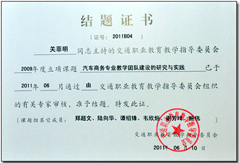 熱烈(liè)祝(zhù)賀由關菲明副(fù)校長主持的,交通職業教育教學指導委員會2009年度立項的省部(bù)級(jí)課題——《汽車商(shāng)務專業教學團(tuán)隊建設的研究與實踐》,經過課題組的全體成員(yuán)鄭超文、陸向華、譚(tán)紹鋒、韋欣烜、謝芳玲等同誌的努力,於(yú)2011年6月10日通(tōng)過專家審核,順利結題。