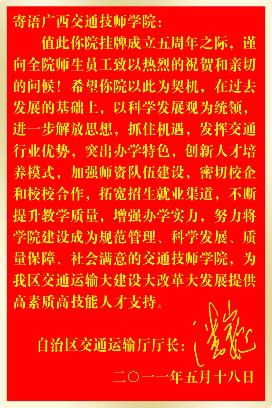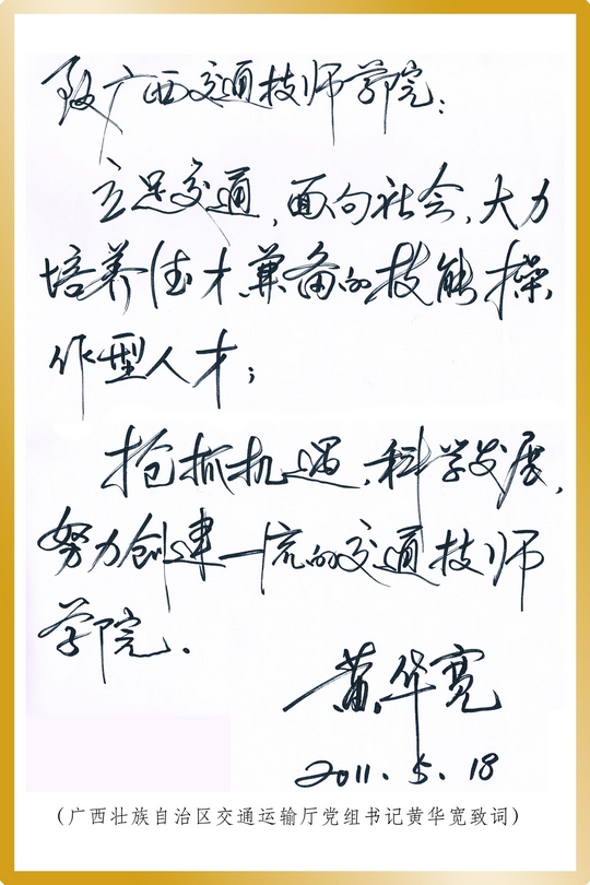 圖5 自治區交通運輸廳黨組書記黃華(huá)寬為我校題詞(cí)