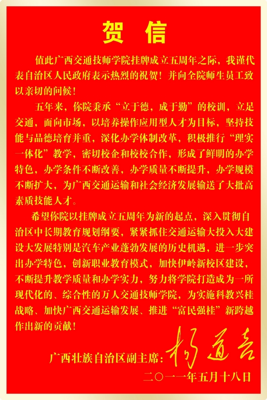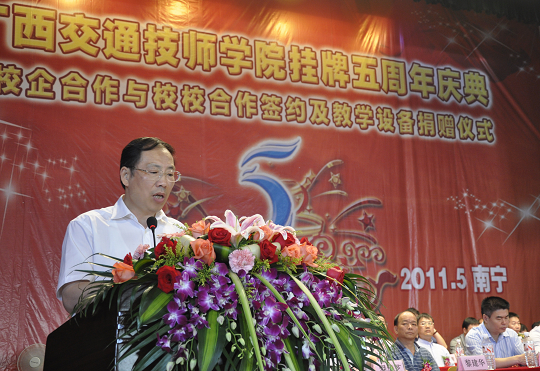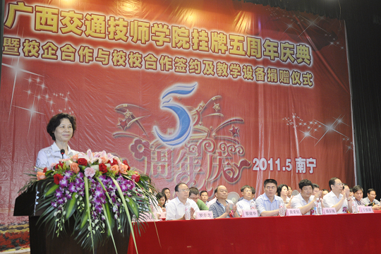 在這歡欣鼓舞的(de)日子裏,上級主管部門(mén)及領導對我校五(wǔ)年來的發展成就給予了高度評價,新聞媒體和社會各界也對我校五年來的(de)辦(bàn)學成果給予了高度關注。自治區副主席楊道喜向我校發(fā)來賀信,自治區(qū)交通運輸廳黨組書記黃華寬為我校題詞,自治區交通運輸廳(tīng)廳長潘巍也為我(wǒ)校發來寄語。同時,自治區人力資源和社會保障廳副廳長於祖毅、自治區交通運輸廳副巡(xún)視員(yuán)黃小幸、廣西陸軍預備役步(bù)兵師首長、自治區道路運輸管理局孫永生(shēng)書記等領導以及各合作(zuò)企業、院(yuàn)校(xiào)、全區80所中學(xué)代表(biǎo)和各友(yǒu)鄰共建(jiàn)單位的領導、嘉賓歡聚一堂,與我校全體教職員工共(gòng)同見證“五周年(nián)慶典”的(de)美好時刻。