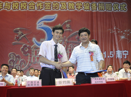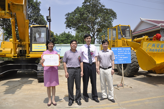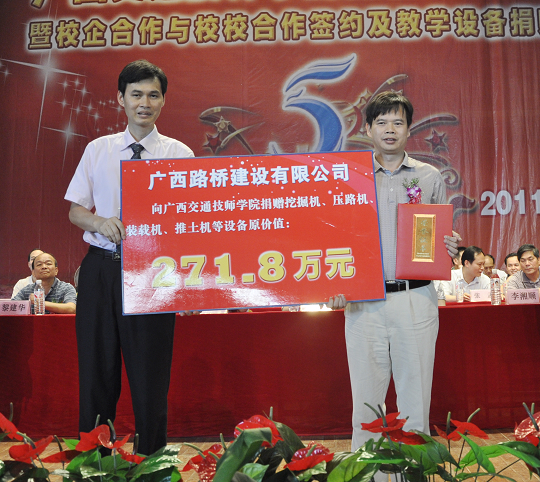 10時50分,教(jiāo)學設備捐贈儀式如期舉行。廣西路橋建設有限公司向我校捐贈了原值271.8萬元的教學(xué)設備(挖掘機、裝載機、推土機、壓路機各一台)。韋紅教院長與廣西(xī)路建公司何崇雄總經理現場(chǎng)交(jiāo)換了捐贈牌匾(biǎn)與證書,雙方熱(rè)情而(ér)友好地握手將現場的氣氛推向了又一個高潮。