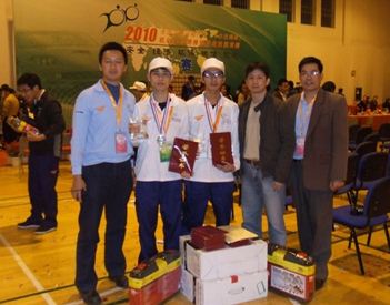 獲獎選手梁(liáng)宏(hóng)毅、高宗上獲獎後(hòu)與廣西隊總領(lǐng)隊湯輝副科(kē)長(右二)及帶隊老師合影