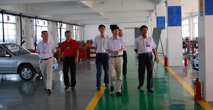 圖三:韋紅教校長(右三)、鍾修仁副校長(右一)陪同晏副總經理(右二(èr))一行參觀學校汽車電氣維修實訓中心(xīn)