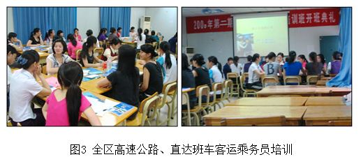 2008年4月至(zhì)6月承擔(dān)全區高速公路(lù)客運、直達班車客運乘務員培訓10期總人數(shù)400多人;2009年(nián)4月至5月承擔高速公路(lù)客(kè)運、直達班車客運乘務員培(péi)訓5期,總計人數180多(duō)人。(見圖3)
